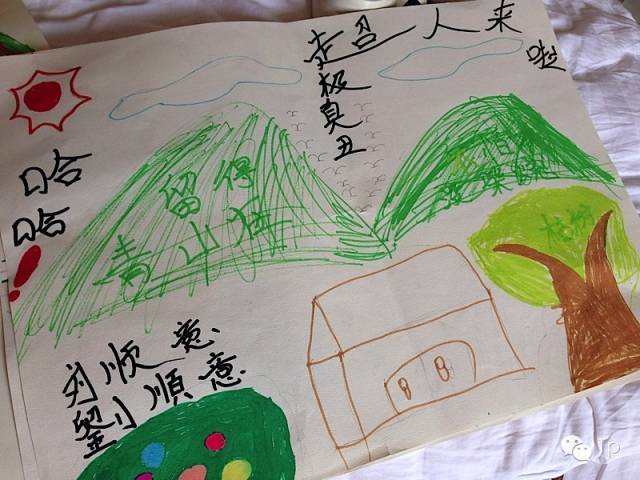 孩子们的画画技巧可能是统一学校教的,常规的太阳、云彩、大山不在少数,许多孩子不愿意让我们看到他们在画什么,有些孩子则非常愿意与你一起分享他的作品,除了画之外画作上的文字让我内心很触动,“留得青山在”、“寂寞的大海”、“丑死了”、文字间透出许多让人深思的信息,我一直很关注的周顺这次则很让我意外,依旧那么腼腆而画风则充满了浓郁的色彩搭配并且红色的爱心占据这整副画纸的大多数位置,这让我很开心毕竟这些孩子在硬件上并不欠缺,而他们最需要的是一种心灵上的陪伴,而最后孩子们将自己的画赠送给我们三个人,让我们非常惊喜也非常的开心,懂得分享的孩子才能更好的得到爱。