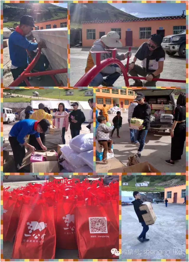 一到学校,志愿者们不顾长途跋涉的舟车劳顿,马上又投入了工作中去,有的整理物资,有的安装运动器材,不一会体育角和洗漱包就准备好了。