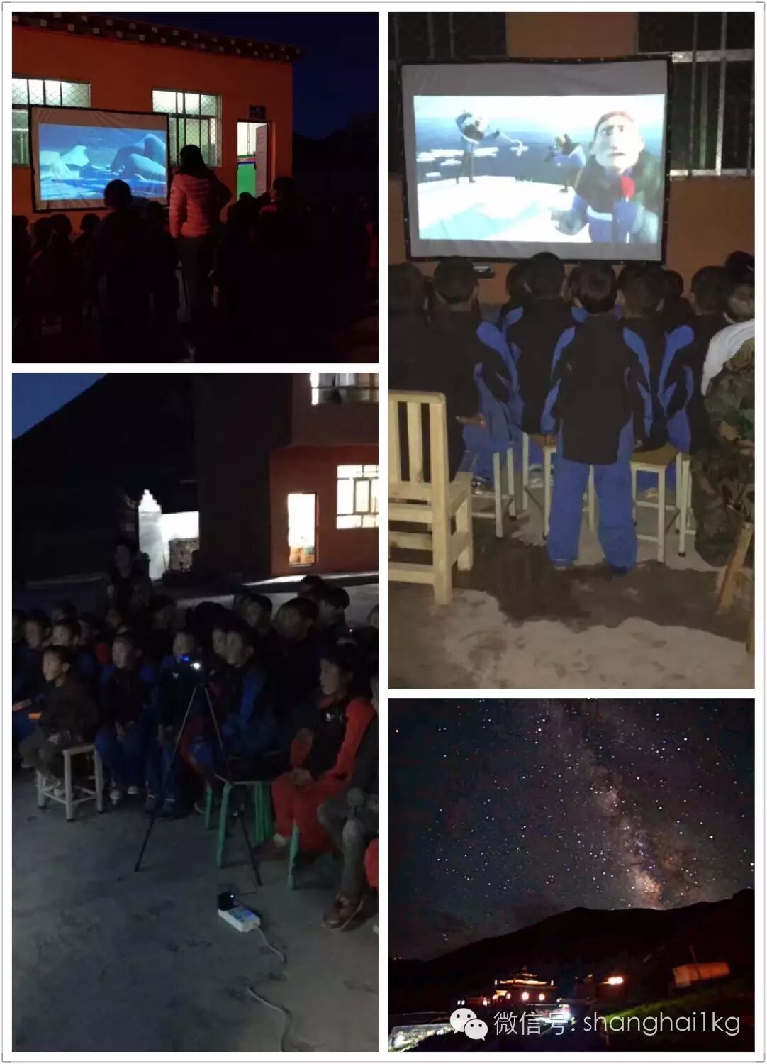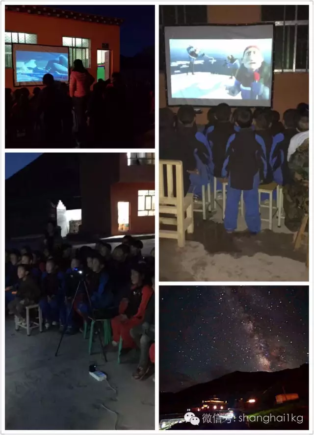 晚上,在繁星点点下,志愿者们一边仰望星空一边准备了投影机为孩子们放了一场室外电影,这对孩子们来说极为新鲜,各个都看的好认真。